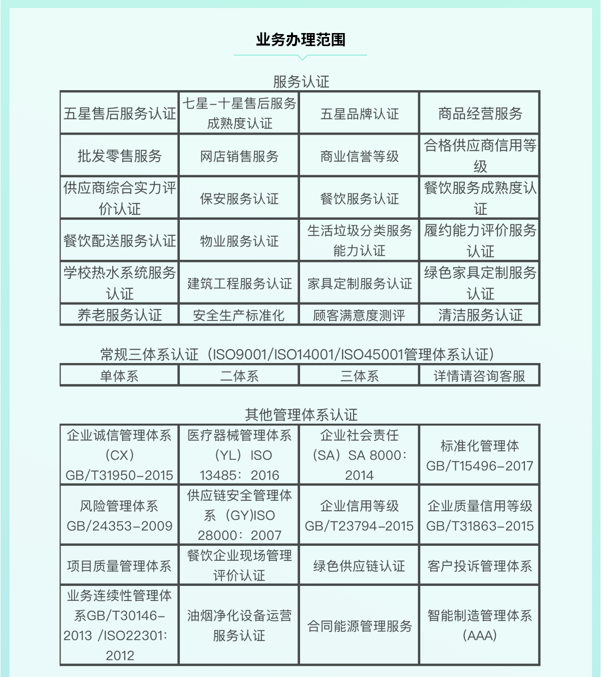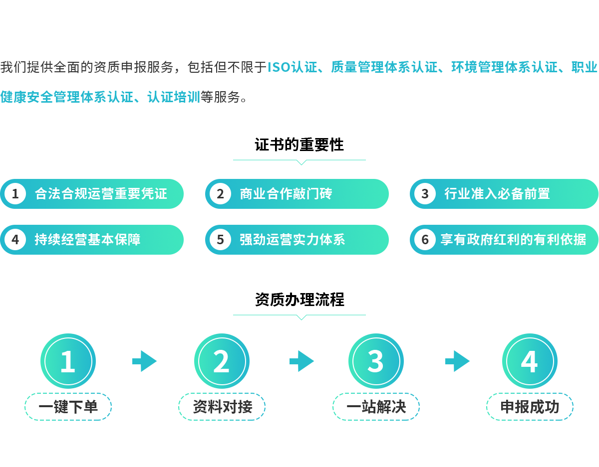 我們提供全面的資質申報服務,包括但不限于ISO認證、質量管理體系認證、環境管理體系認證、職業健康安全管理體系認證、認證培訓等服務。