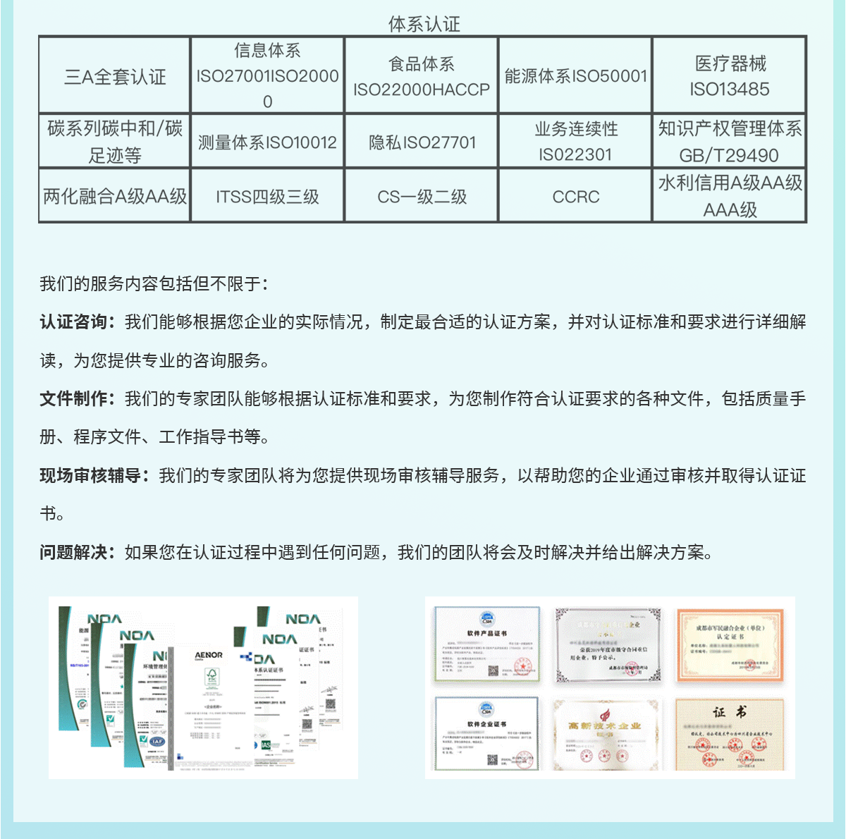 認證咨詢:我們能夠根據您企業的實際情況,制定最合適的認證方案,并對認證標準和要求進行詳細解讀,為您提供專業的咨詢服務。