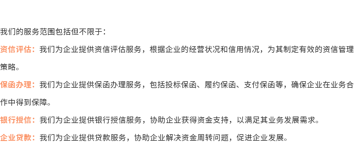 銀行授信:我們為企業提供銀行授信服務,協助企業獲得資金支持,以滿足其業務發展需求。?