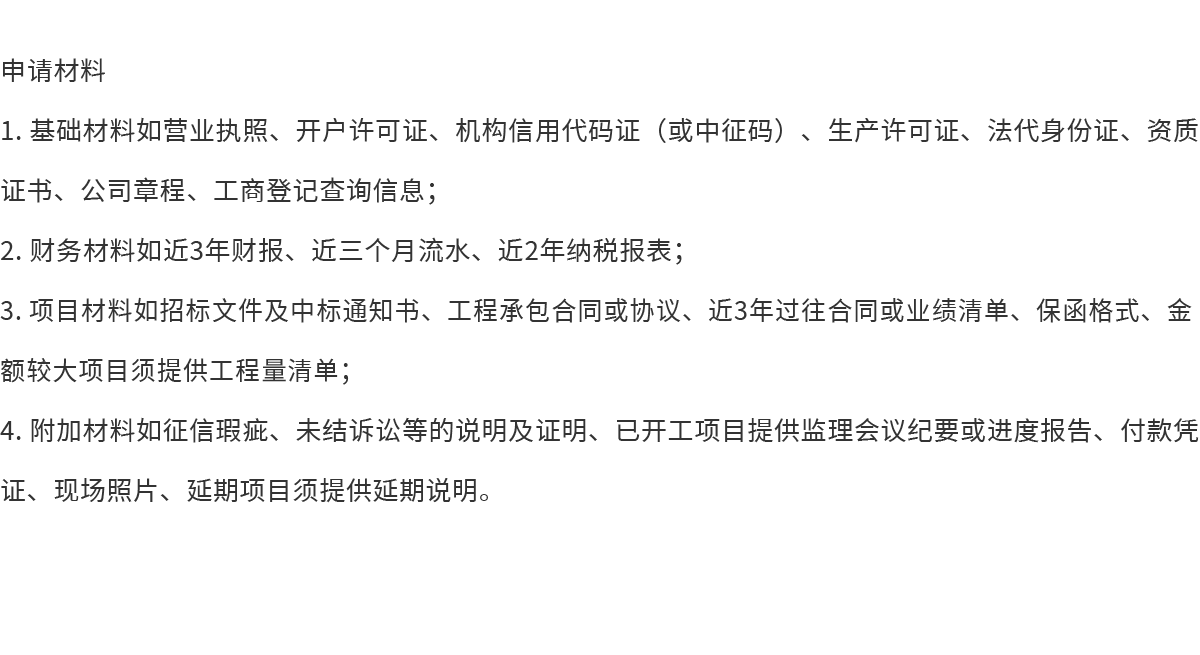 4. 附加材料如征信瑕疵、未結訴訟等的說明及證明、已開工項目提供監理會議紀要或進度報告、付款憑證、現場照片、延期項目須提供延期說明。
