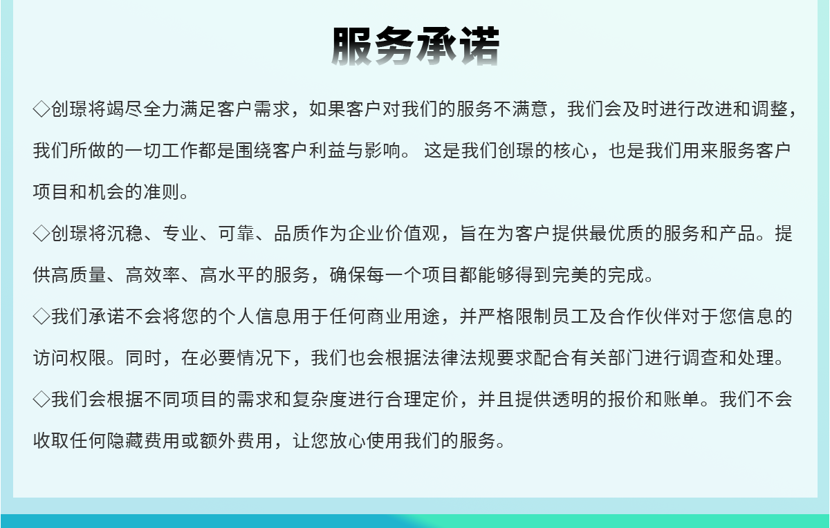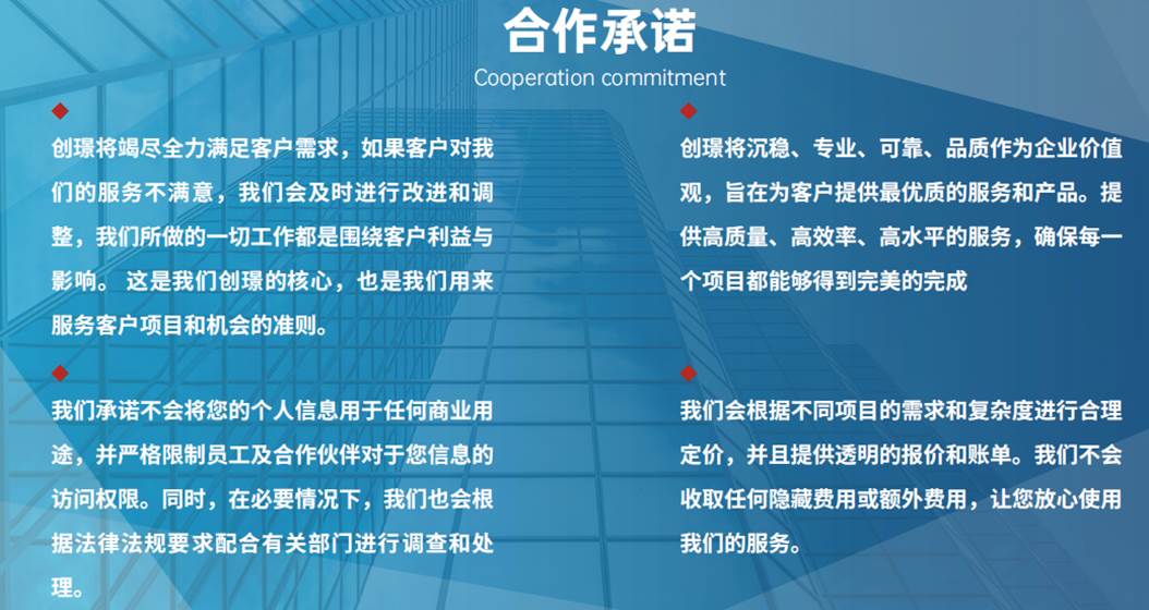 ◇創(chuàng)璟將沉穩(wěn)、專業(yè)、可靠、品質(zhì)作為企業(yè)價(jià)值觀,旨在為客戶提供最優(yōu)質(zhì)的服務(wù)和產(chǎn)品。提供高質(zhì)量、高效率、高水平的服務(wù),確保每一個(gè)項(xiàng)目都能夠得到完美的完成。