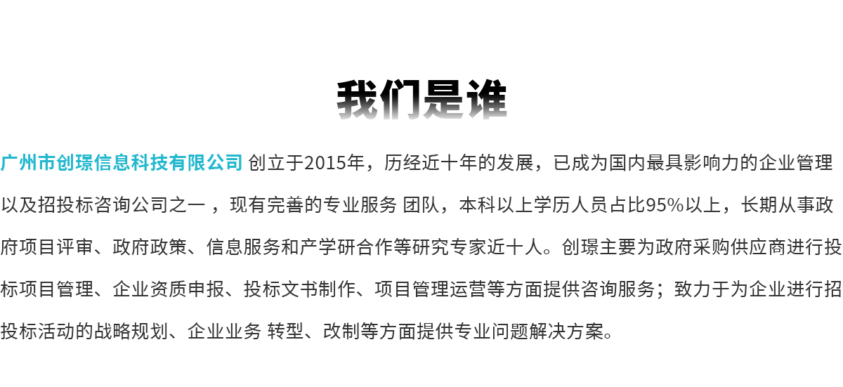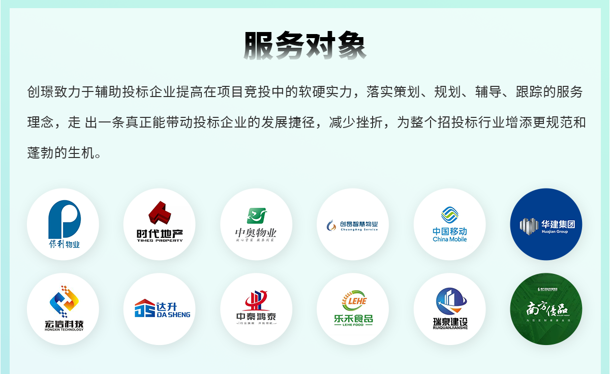 創(chuàng)璟致力于輔助投標(biāo)企業(yè)提高在項(xiàng)目競(jìng)投中的軟硬實(shí)力,落實(shí)策劃、規(guī)劃、輔導(dǎo)、跟蹤的服務(wù)理念,走 出一條真正能帶動(dòng)投標(biāo)企業(yè)的發(fā)展捷徑,減少挫折,為整個(gè)招投標(biāo)行業(yè)增添更規(guī)范和蓬勃的生機(jī)。